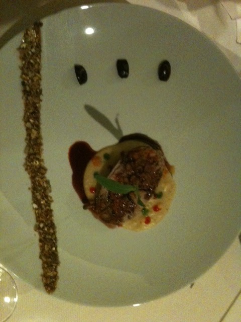 The second course arrived after the light red blend was poured--this was my favorite, (as well as Gary's), wine of the night. And, they kept refilling glasses, so I have no idea how much wine I actually drank. Goober. Anyway, the tiny quail was stuffed with wild game pate. I. do. not. like. wild. game. And. I. loved. this! Oh, help it was so beautifully seasoned and just disappeared down my throat sooo quickly! You can see the caramel corn & nuts in a strip down the side of the plate--so unusual, but went so well with the quail, as did the yummy polenta. Oh, my. Here's Gary's photo because mine showed my dirty bread plate next to it. Classy. Remember, people, I was drinking wine and had a phone camera. The two are